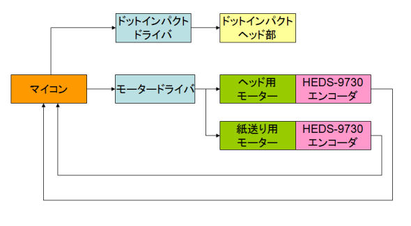 プリンタのヘッド部分に取り付けたエンコーダからは、ドットピンの配置間隔と同じ180dpi(25.4mm/180=0.141mm)間隔相当のA相、B相パルス信号が出力されます。このA相とB相のパルス信号を基に、制御側でプリンタヘッドの位置を確認しながら、印字したい文字に合わせてドットピンを打ち出していきます。このプリンタヘッドが用紙の端までいくと、紙送り用モーターが回転し、用紙を所定の位置まで移動させます。この送り量も正確に回転させないと、最初に印字した位置とズレてしまうので、エンコーダの出力パルス信号を基に制御します。