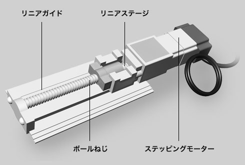 モーターによる回転動作をリニアステージの水平移動に変換しているのは、1本の軸に通常のねじと同じようなねじ山が刻まれている、ボールねじと呼ばれる部品です。ねじ部分とリニアステージ部分が接触しているため、モーターが回転してボールねじを回転させると、ねじ回転にそってリニアステージを水平方向に移動させることができます。