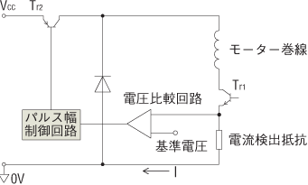 電流検出抵抗でモーター巻線に流れる電流を電圧として取り出し、基準電圧と比較します。検出抵抗の電圧が基準電圧よりも低いとき(定格電流に達していないとき)は、スイッチングトランジスタTr2を引き続きONし、基準電圧より高いとき(定格電流を超えたとき)は、Tr2をOFFし、常に定格電流が流れるように電流制御しています。